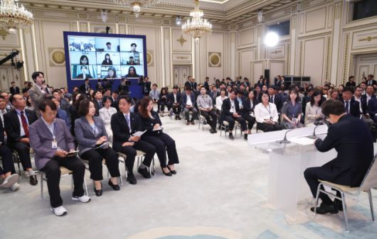 이 대통령은 이날 청와대 영빈관에서 '대통령의 30일, 언론이 묻고 국민에게 답한다'는 제목으로 취임 30일 기자회견을 진행했다. 당초 1시간30분으로 예정됐던 기자회견은 2시간을 넘겨 오전 10시부터 낮 12시까지 진행됐다. 이날 기자회견에는 대통령실 참모진을 비롯해 147명의 기자들이 자리했다.