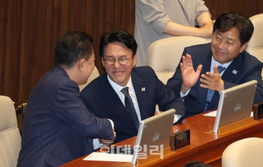 [이데일리 노진환 기자] 김민석 국무총리 후보자가 3일 오후 서울 여의도 국회에서 열린 제426회국회(임시회) 제4차 본회의에서 국무총리(김민석) 임명동의안에 표결 후 동료 의원들과 악수하고 있다. |