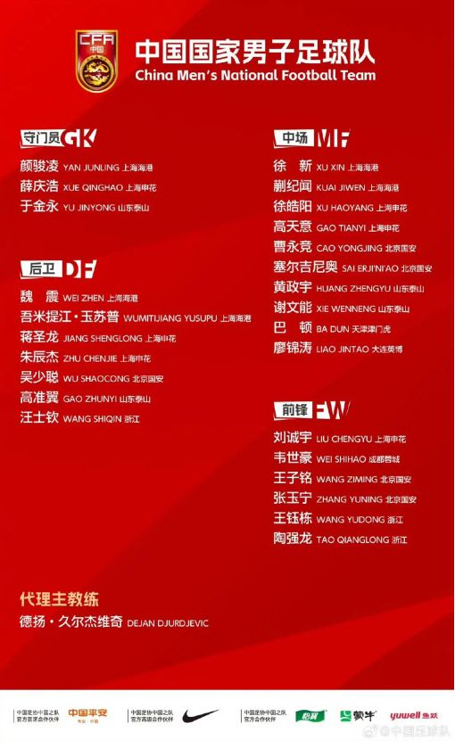 이어 3일 뒤인 30일, 협회는 동아시안컵에 출전할 26인 명단을 발표했는데 어린 선수들이 대부분이었다. 웨이스하오, 주천제, 시에원넝, 황정위, 차오용징 등 중국 축구대표팀의 주축 선수들이 그대로 선발된 와중에 왕위동, 류청위 등 지난 2월 중국에서 열린 아시아축구연맹(AFC) 20세 이하(U-20) 아시안컵에서 좋은 활약을 보여준 2006년생 선수들이 동아시안컵을 앞두고 대표팀 명단에 '젊은 피'로 합류했다.