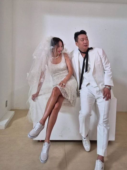 공개된 사진 속 김지혜와 박준형은 결혼 20주년을 맞아 리마인드 웨딩 화보를 촬영 중이다. 흰색 드레스를 입은 김지혜와 캐주얼한 정장을 입은 박준형은 다정한 부부 케미스트리를 보이며 촬영에 임하고 있다.