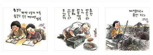 몽당연필 심이 희미해서 침을 발라 눌러쓰면 쓸 수 있다는 뜻이다.(왼쪽)/제사 때 산적을 구우려 하는데 숯이 축축하여 부채질로 불을 붙여야 한다는 내용.(가운데)/제주도 통시에서 돼지를 키울 때 어린이가 볼일 보며 돼지가 접근하지 못하게 작대기를 들고 방어태세를 갖추고 있다. |