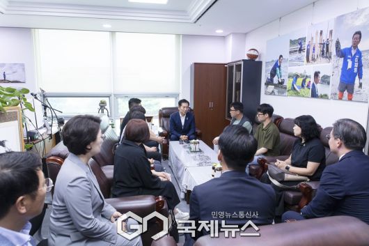 ▲정청래 더불어민주당 당대표 선서 출마자는 3일 국회의원회관에서 오송 참사 유가족·생존자들과 간담회를 하고 있다./정청래의원실 |