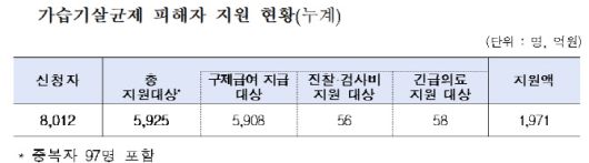 이날 위원회는 신규로 피해가 인정된 48명의 구제급여 지급 결정과 함께, 피해는 인정받았으나 피해등급을 결정받지 못했던 피해자 등 35명의 피해등급 등을 결정했다. 구제급여 지급 및 피해등급 결정을 받은 피해자에는 폐암 피해자 11명이 포함됐다. 이에 따라 가습기살균제 구제급여 지급 대상자는 총 5908명이 됐다.
