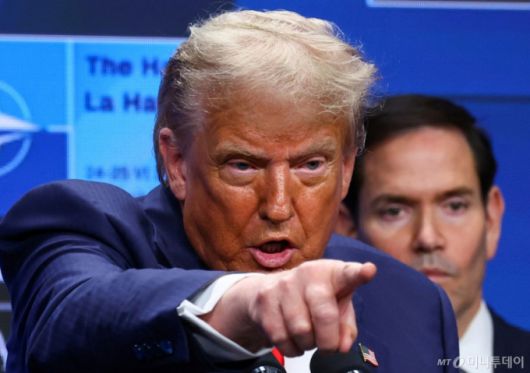 도널드 트럼프 미국 대통령이 지난달 25일(현지시간) 네덜란드 헤이그에서 열린 북대서양조약기구(NATO·나토) 정상회의를 계기로 연 기자회견에서 질문자를 지정하고 있다. 트럼프 대통령의 뒤로 마코 루비오 미국 국무부 장관이 보인다. / 로이터=뉴스1 |