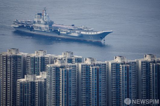 [서울=뉴스핌] 중국의 첫 항공모함인 산둥함이 3일(현지시간) 5일 간의 방문을 위해 홍콩으로 입항하고 있다. [사진=로이터] 2025.07.03 photo@newspim.com