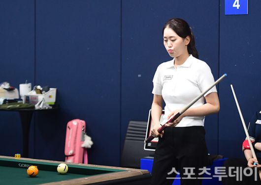 [고양(경기)=스포츠투데이 권광일 기자] 2025-2026 시즌 LPBA 2차 투어 '하나카드 LPBA 챔피언십' 16강전 경기가 3일 경기 고양시 킨텍스 PBA스타디움에서 열렸다. 최지민이 16강전 경기에서 라인을 확인하고 있다. 2025.07.03. [스포츠투데이 권광일 기자 sports@stoo.com]