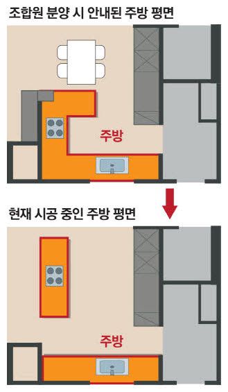 문제는 실제 인허가를 받고 현재 시공 중인 주방은 '일자형'이라는 점이다. 인덕션과 후드가 설치된 대형 아일랜드 식탁이 'ㄷ자형 주방' 대신 들어선 모습이다.