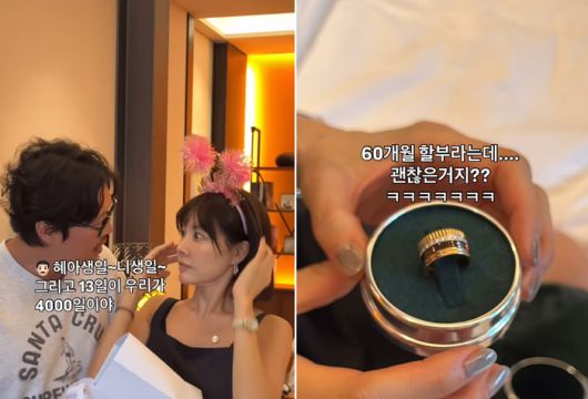 영상에는 양미라가 남편으로부터 “혜아 생일, 네 생일, 그리고 13일이 우리가 4000일이야. 4000일 선물이다”라는 말과 함께 하얀 쇼핑백을 건네받는 모습이 담겼다. 쇼핑백 안에는 명품 브랜드의 반지가 들어 있었고, 남편은 직접 반지를 손가락에 끼워주며 손등에 입을 맞추는 등 애정을 드러냈다.