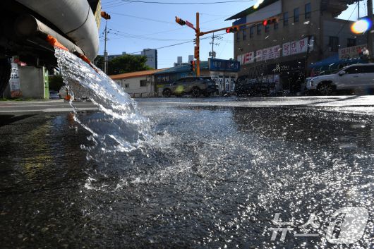 3일 오전 경북 포항시 전역에 폭염경보가 발령 중인 가운데 북구 포항국제전시컨벤션센터 공사 현장 앞 도로에서 살수차가 도로에 물을 뿌리고 있다. 2025.7.3/뉴스1 ⓒ News1 최창호 기자 |