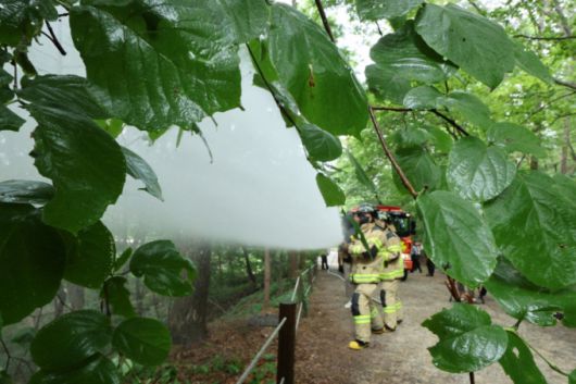 3일 오후 서울 노원구 삼육대학교 신학관 뒤로 이어진 등산로에 소방 살수차가 1대 들어섰다. 이날 기온은 영상 31℃(도)를 넘었고 습도는 51%에 달했다. 현재까지 추적 관찰에 따르면 러브버그가 폭증하기 좋은 환경이다. 소방관 2명이 소방호스를 잡고 나뭇잎과 나무 줄기를 향해 물을 뿌렸다. 물에 약한 러브버그를 방제하기 위해서다.