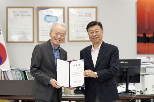 신상진 성남시장(오른쪽)이 3일 오후 시청 집무실에서 금난새 지휘자에게 성남물빛정원 음악홀 명예 예술감독 위촉장을 수여하고 기념촬영을 하고 있다. 성남시 제공 |