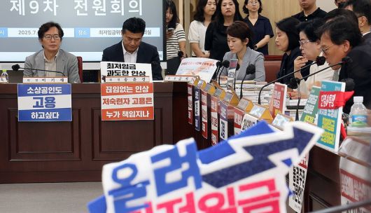 | 3일 정부세종청사에서 열린 최저임금위원회 제9차 전원회의. 근로자위원들이 최저임금 올릴 것을 요구하는 동안 사용자위원들은 반대 입장을 표명하고 있다. / 사진 = 연합뉴스 |