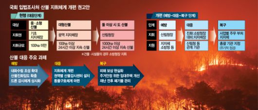 연례행사처럼 반복되는 영남지역 대형 산불과 관련해 전문가들은 산불대응 주관기관을 하나로 통일하기 위한 일부 법령 개정이 필요하다고 지적한다. 또 실화에 따른 산불이 늘어나는 만큼, 이에 대한 처벌 강화 등 실효성 있는 조치도 필요한 상황이다.