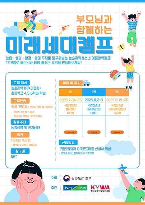 농협중앙회(회장 강호동)는 3일 농림축산식품부 및 한국청소년활동진흥원과 함께 오는 7월부터 전국 농촌지역에 거주하는 4학년 이상(다문화) 초등학생을 대상으로 부모님과 함께하는 '2025년 미래세대캠프'를 운영한다고 밝혔다.