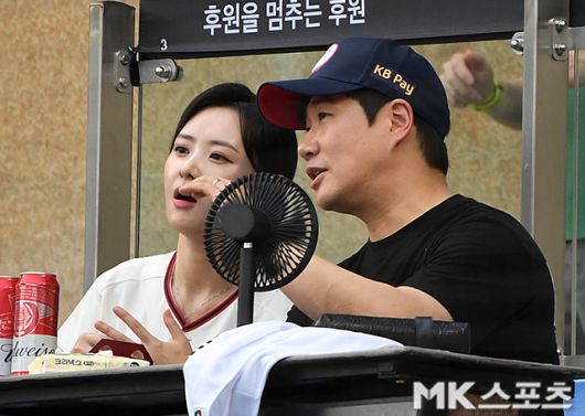 이날 시구자로 나선 배성재 아나운서가 아내 김다영 아나운서와 함께 경기를 관람하고 있다.