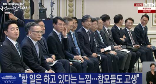 취임 30일 기자회견 중 참모들 반응 '화제'