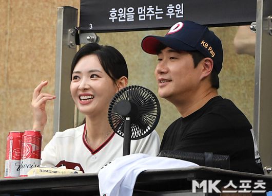 이날 시구자로 나선 배성재 아나운서가 아내 김다영 아나운서와 함께 경기를 관람하고 있다.