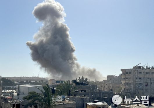 21일(현지시간) 가자지구 남부 라파에서 이스라엘군의 공격에 연기가 피어 오르는 모습. [사진=로이터 뉴스핌] |