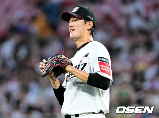 [OSEN=수원, 최규한 기자] 3일 수원 KT위즈파크에서 ‘2025 신한 SOL Bank KBO리그’ KT 위즈와 키움 히어로즈의 경기가 열렸다. 홈팀 KT는 고영표, 방문팀 키움은 정현우를 선발로 내세웠다. 5회초 무사 선두타자로 나선 키움 어준서를 외야 뜬공을 이끈 KT 선발 고영표가 야수들에게 공을 건네받고 있다. 2025.07.03 / dreamer@osen.co.kr
