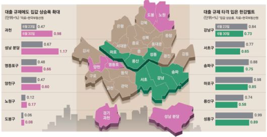 고공 행진하던 서울 아파트값 상승률이 정부의 강력한 대출 규제 여파로 주춤하는 모습이다. 그간 급등세를 주도하던 서울 강남 3구(강남·서초·송파구)와 마용성(마포·용산·성동구) 등 ‘한강벨트’ 지역의 집값 상승폭이 소폭 축소됐다.