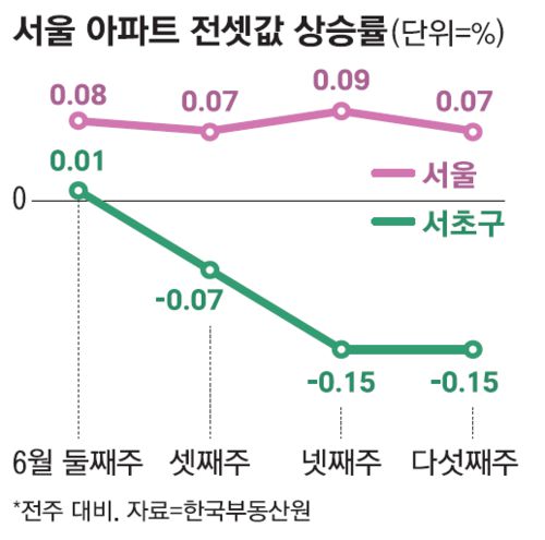 대출 규제와 입주장 여파로 전셋값 상승세는 둔화되는 모양새다. 한국부동산원 주간 아파트 가격 동향에 따르면 6월 다섯째주(30일 기준) 서울 아파트 전셋값은 전주 대비 0.07% 올랐다. 여전히 상승세는 유지되고 있지만 상승폭은 전주(0.09%) 대비 0.02%포인트 낮아졌다. 메이플자이(3307가구)가 입주 중인 서초구는 이번주 전셋값이 0.15% 떨어졌다.