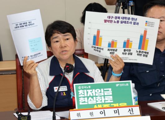 최저임금위원회 근로자위원인 이미선 민주노총 부위원장이 3일 정부세종청사에서 열린 최저임금위원회 제9차 전원회의에서 ‘대구-경북 대학생-청년 열악한 노동 실태조사 결과’를 보이며 발언하고 있다. 세종 연합뉴스 |