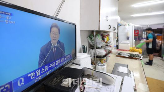 3일 오전 서울 서대문구 인왕시장에서 상인들이 이재명 대통령의 취임 30일 기념 기자회견을 시청하고 있다.(사진=이영훈 기자) |
