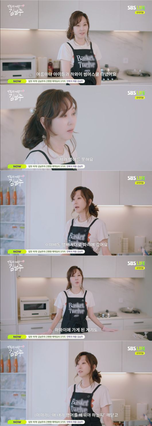 김남주는 “아이를 낳으면 꼭 영어를 가르치리라 (라고 다짐했다) 하와이에 가게 된 계기도 (아이가) ‘왜 내가 영어를 배워야 하는지’ 깨닫고 영어를 해야 하는 이유를 알게 하는 거지”라고 말했다.
