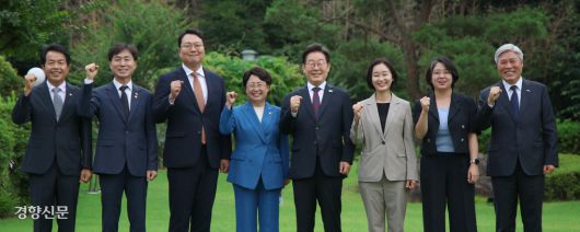 이재명 대통령이 3일 한남동 관저에서 비교섭단체 5당 지도부와의 오찬 회동에 앞서 기념촬영을 하고 있다. 왼쪽부터 윤종오 진보당 원내대표, 한창민 사회민주당 대표, 천하람 개혁신당 대표 권한대행, 김선민 조국혁신당 대표 권한대행, 이 대통령, 김재연 진보당 상임대표, 용혜인 기본소득당 대표, 서왕진 조국혁신당 원내대표. 김창길 기자 |