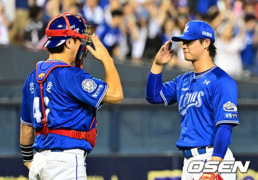 경기를 마치고 삼성 강민호. 이호성이 승리 세리머니를 하고 있다. 2025.07.03 /jpnews@osen.co.kr