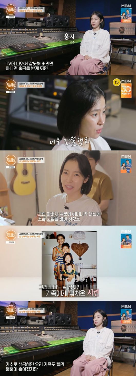 이에 홍자가 트로트 가수의 길을 걷게 됐다고. 그는 “내가 노래에 조금 소질이 있다 했는데 우연한 기회로 트로트 작곡가님을 만나게 됐다. 가수 해보지 않을래 하셔서 가수로 성공하면 가족이 뿔뿔이 흩어졌지만 모일 수 있겠다 해서 하게 됐다”고 말했다.