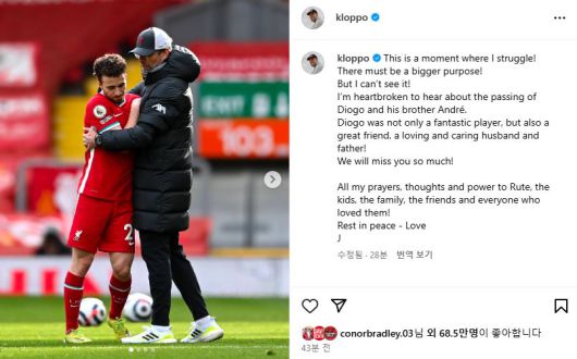 현 리버풀 동료 다윈 누녜스는 "말로 표현할 수 없는 고통이다. 디오고는 항상 웃고 있던 좋은 동료였다. 그는 하늘에서도 가족을 지켜줄 것"이라며 함께 찍은 사진과 추모글을 게시했다.