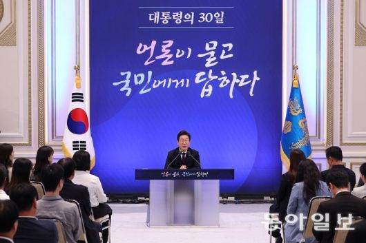 이재명 대통령이 3일 서울 종로구 청와대 영빈관에서 열린 취임 첫 공식 기자회견 ‘대통령의 30일, 언론이 묻고 국민에게 답하다’에 참석해 기자 질문에 답변하고 있다. 송은석 기자 silverstone@donga.com |