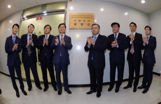 2016년 11월, 박영수 특별검사팀이 서울 강남구 대치동에 마련된 특검 사무실에서 현판식을 하고 있다. 왼쪽부터 어방용 수사지원단장, 윤석열 수사팀장, 양재식 특검보, 박충근 특검보, 박영수 특검, 이용복 특검보, 이규철 특검보, 조창희 사무국장. /연합뉴스 |
