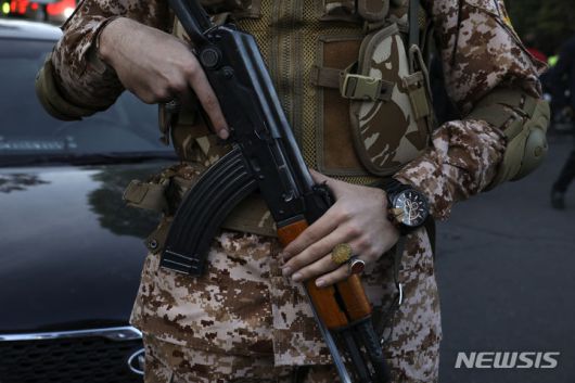 [테헤란=AP/뉴시스] 이란에서 지난 2021년부터 올해까지 스위스 외교관과 관련 인물 4명이 잇따라 의문사한 것으로 알려지면서, 외교관 안전에 대한 우려가 제기되고 있다. 이란 테헤란의 팔레스타인 광장에서 이란혁명군수비대 대원이 반이스라엘 시위대 주변을 경계하는 모습. 2025.07.04 |