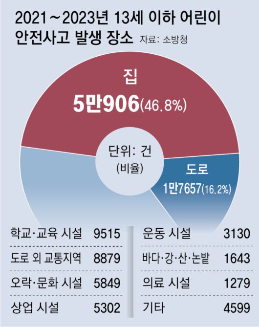 소방청에 따르면 2021∼2023년 발생한 어린이 안전사고 10만8759건 중 절반에 가까운 5만906건(46.8%)이 가정 내에서 발생했다. 학교(9515건) 등 교육 시설과 비교해 5배 이상 높은 수치다. 일반적으로 ‘집이 가장 안전하다’는 인식이 널리 퍼져 있지만, 실제로는 가정이 어린이 안전사고가 가장 많이 발생한 장소인 셈이다.