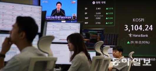 李 “‘5000피’ 시대 준비”… 코스피, 연고점 경신 3일 오전 서울 하나은행 본점 딜링룸 전광판에 이재명 대통령의 취임 후 첫 기자회견 생방송이 송출되고 있다. 이 대통령은 모두발언에서 “‘자본시장 선진화’를 통해 ‘코스피 5,000 시대’를 준비하겠다”고 강조했다. 이날 코스피는 전 거래일보다 41.21포인트(1.34%) 오른 3,116.27로 마감하며 연고점을 경신했다. 홍진환 기자 jean@donga.com |