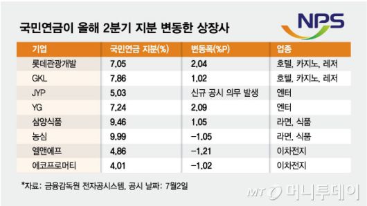 국민연금은 YG엔터(와이지엔터테인먼트)주식 39만주를 추가 매입해 지분율이 기존 5.15%에서 7.24%로 2.09%포인트 높아졌다. JYP(JYP Ent.) 주식 역시 추가로 4만8500여주를 매입, 지분율 5%이상을 보유하게 되면서 신규 보고 의무가 발생했다.