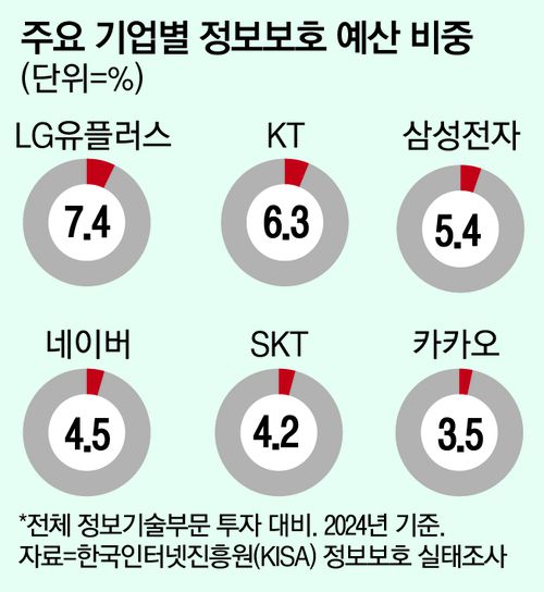 개별 기업 단위로 보면 대규모 해킹 사태를 겪은 SK텔레콤이 전체 IT 예산의 4.2%를 정보보호 투자로 집행했다. KT(6.3%) LG유플러스(7.4%) 대비 낮은 수준이다.