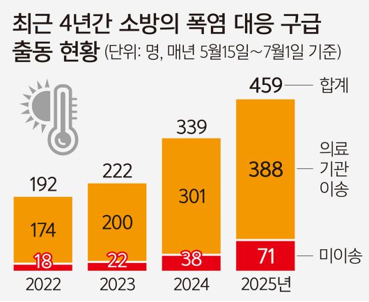 소방청에 따르면 전국 500여개 응급실을 대상으로 온열질환 감시체계가 가동된 5월15일부터 이달 1일까지 온열질환에 따른 의료기관 이송 인원은 388명으로 2022년(174명)의 2배를 넘어섰다. 2023년 200명, 지난해는 301명으로 최근 4년간 증가세다. 같은 기간 구급 대원 출동은 총 458건으로 경북이 69건으로 가장 많았고 경기(60건), 전북(55건), 충남(46건), 전남(37건) 등의 순이다.
