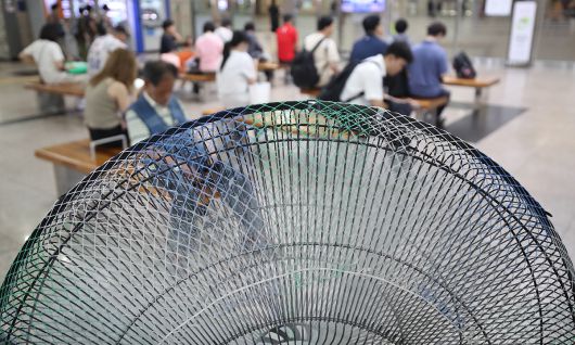 일주일째 폭염특보가 이어진 3일 대구 북구 대구역 대합실에서 시민들이 대형 선풍기 앞에 앉아 열차를 기다리고 있다. 뉴스1 |