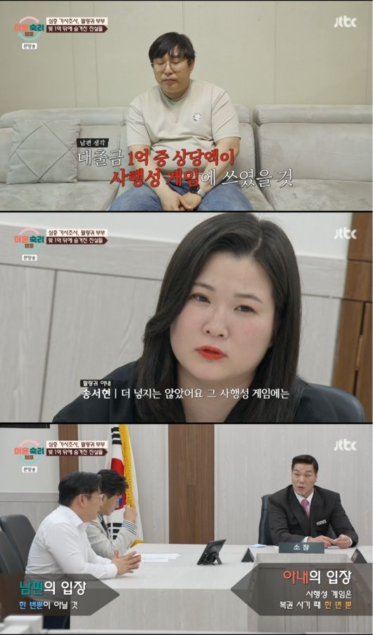 남편의 대출금이 아내가 사행성 게임에 쓰였을 거라고 의심하는 남편은 “빚 1억 원 중 전부를 (게임에) 쓰지는 않았을 거예요. 다만 항상 빌려주면 어디에 썼는지 얘기를 안 해주니까”라고 밝혀 눈길을 끌었다.