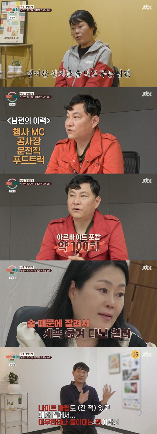 남편은 행사 MC, 공사장, 운전직, 푸드트럭 등 아르바이트를 포함해 옮긴 직장만 100번이라고 전하며, 옮긴 이유가 모두 술 때문이라고 말했다.