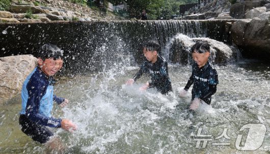 연일 한낮 최고기온이 30도를 넘기며 무더운 날씨가 이어진 가운데 3일 충남 공주 동학사 계곡에서 아이들이 물놀리를 하며 더위를 식히고 있다. 2025.7.3/뉴스1 ⓒ News1 김기태 기자 |