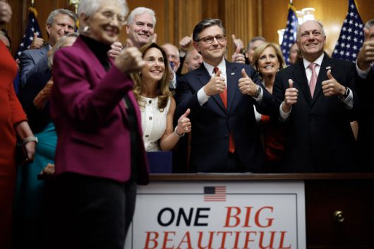 마이크 존슨 미 하원의장이 3일(현지시간) 미 워싱턴D.C 국회의사당에서 ‘크고 아름다운 법안’ 통과를 축하하고 있다. (사진=AFP) |