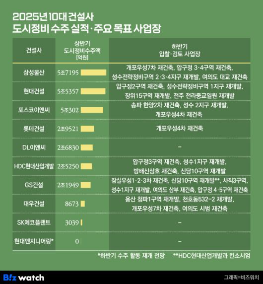 지난달까지 5조5357억원을 수주한 현대건설은 성수1지구 외에 압구정2구역 수주를 목표로 하고 있다. 지난달 23일에는 성북구 장위15구역 재개발에도 단독으로 입찰했다. 전라북도 전주 전라중교일원구역 재개발 참여도 검토 중이다.