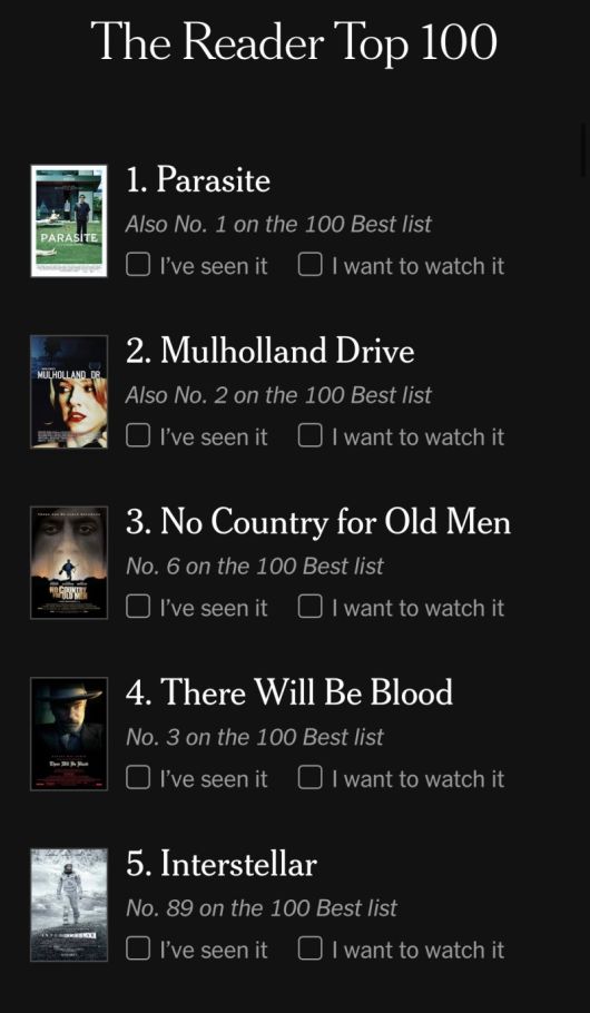 NYT 독자들이 뽑은 21세기 최고의 영화. 뉴욕타임스 앱 캡처. /사진=뉴시스 |