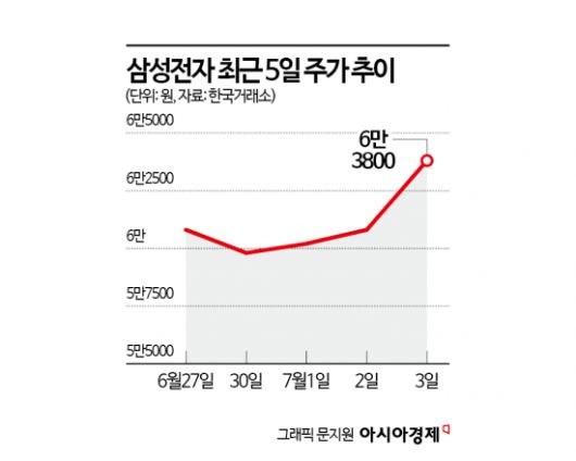 4일 한국거래소에 따르면 전일 삼성전자는 4.93% 오른 6만3800원에 마감했다. 지난해 9월27일(6만4200원) 이후 가장 높은 수준이다.