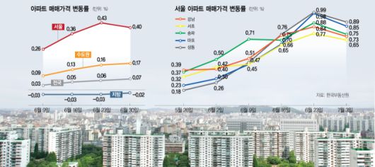 또 7월부터 총부채원리금상환비율(DSR) 3단계 대출 규제 시행되면서 6월 집중됐던 ‘막차 수요’가 줄어들기 시작한 것도 상승세에 제동이 걸린 요인으로 꼽힌다. 한국부동산원의 한 관계자는 “재건축 추진 단지 및 주요 단지 등 중심으로 매매가격이 상승하는 가운데 선호지역 내 매수문의 감소하면서 서울 전체 상승 폭이 소폭 축소됐다”고 설명했다.