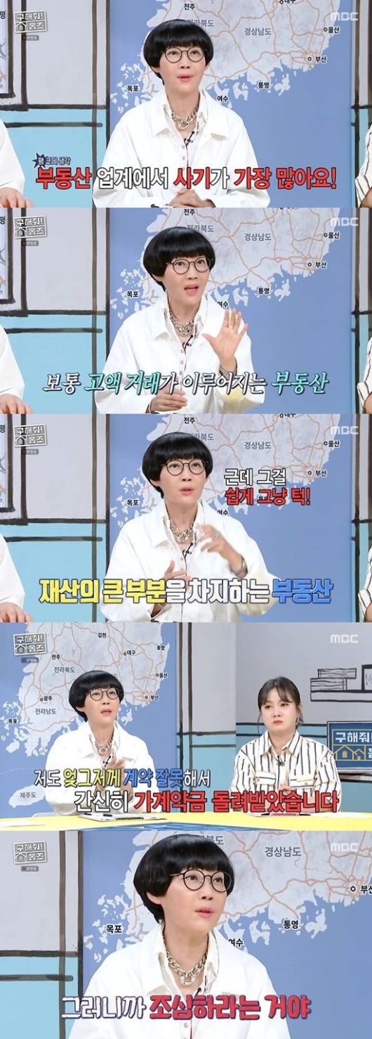 이어 팽현숙은 "사실 저도 엊그제 계약을 잘못해서 간신히 가계약금을 돌려받았다"고 말했고, "부동산 공부를 많이 하는데도 사기를 당할 수 있는 것인가"라는 장동민의 말에 "그러니까 더 조심하라는 것이다"라고 강조했다.